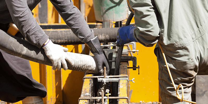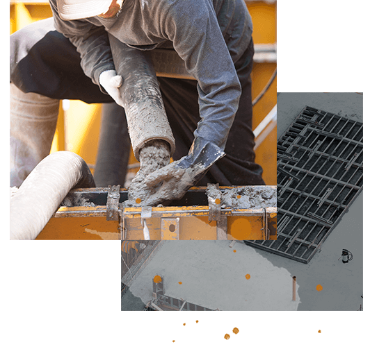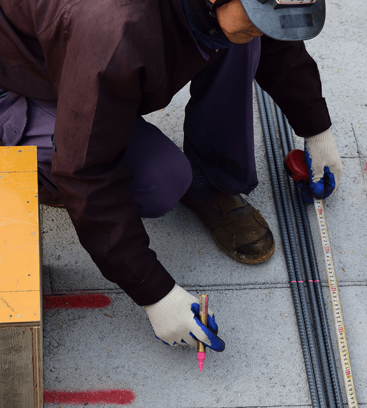コンクリート打設とは、型枠の中に生コンクリートを流し込んでいく作業のこと。型枠の隅々にまで生コンクリートが均等に行き渡るよう、注意深く作業します。